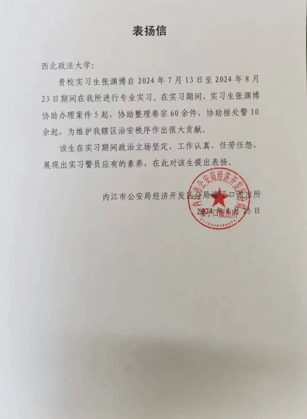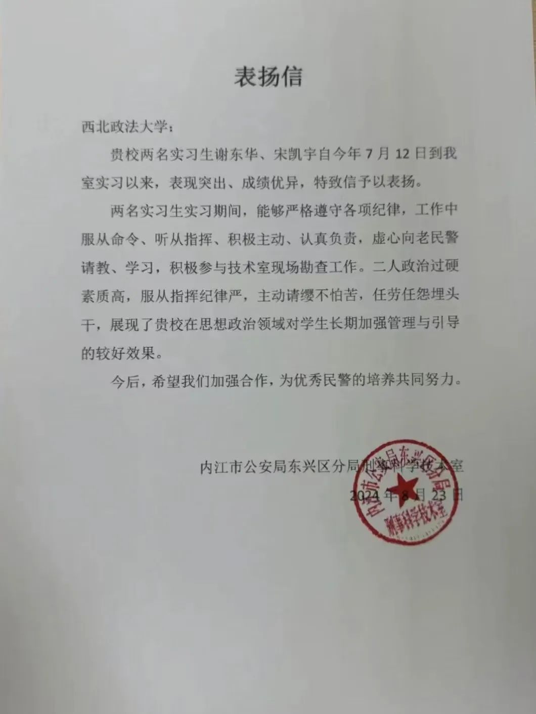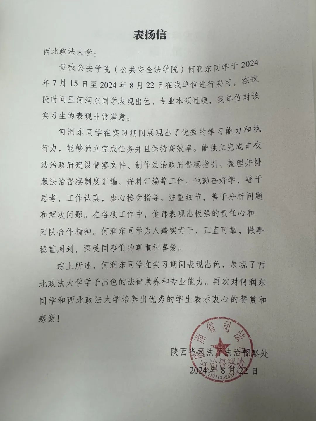 在暑期实习中,我院学子严格遵守纪律,主动承担任务,不畏艰辛,勤奋工作,其优秀的实习表现和积极的工作态度赢得了实习单位的一致好评。陕西省司法厅法治督察处、内江市公安局东兴区分局刑事科学技术室、内江市公安局经济开发区分局壕子口派出所、广州市公安局番禺区分局新客运站派出所、广州市公安局番禺区分局大石派出所、陕西省宝鸡市中级人民法院审判督察庭等单位对我院学子给予充分肯定,并致以表扬信,这是他们在实习中勇于探索、勤于实践的最好证明。