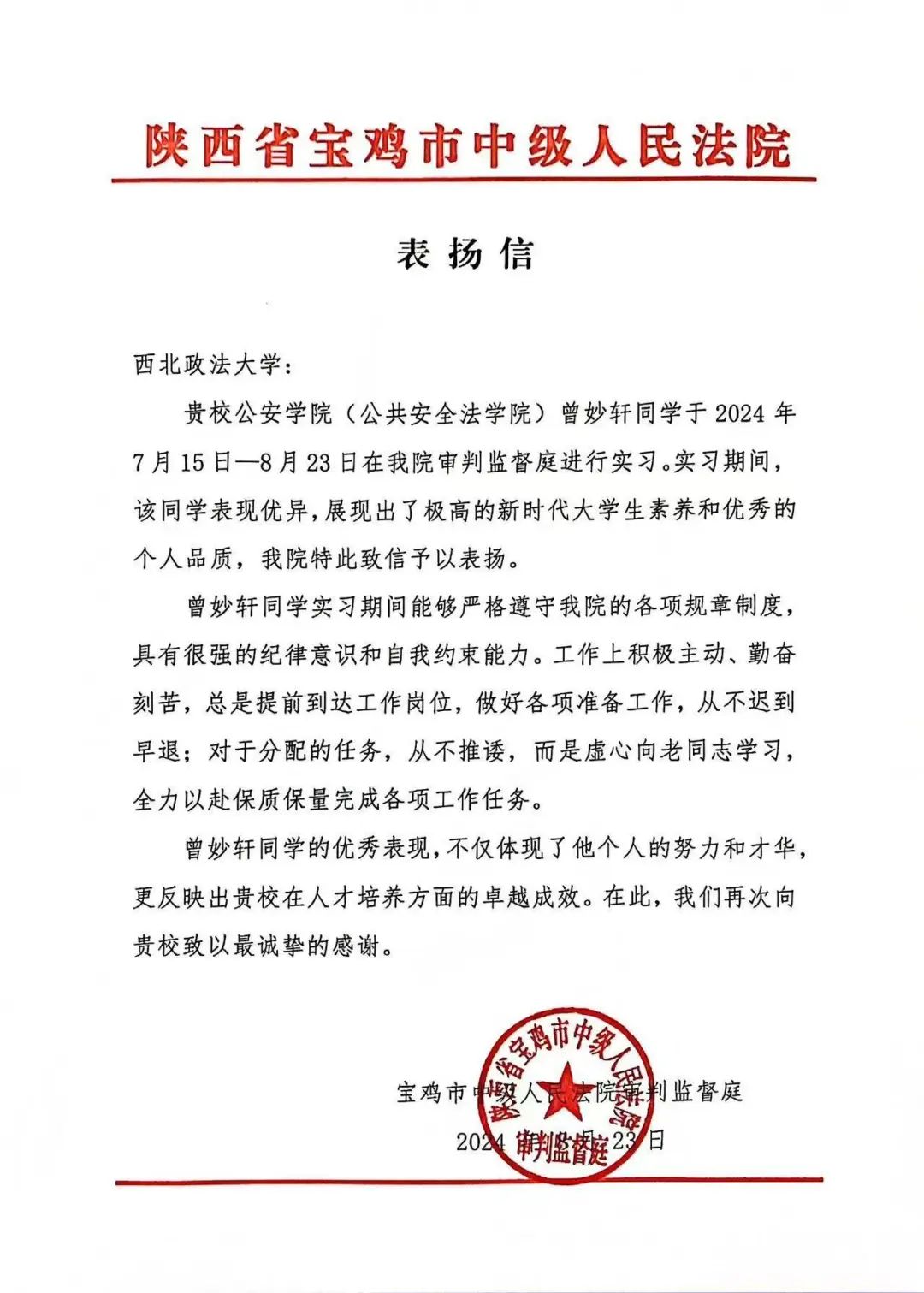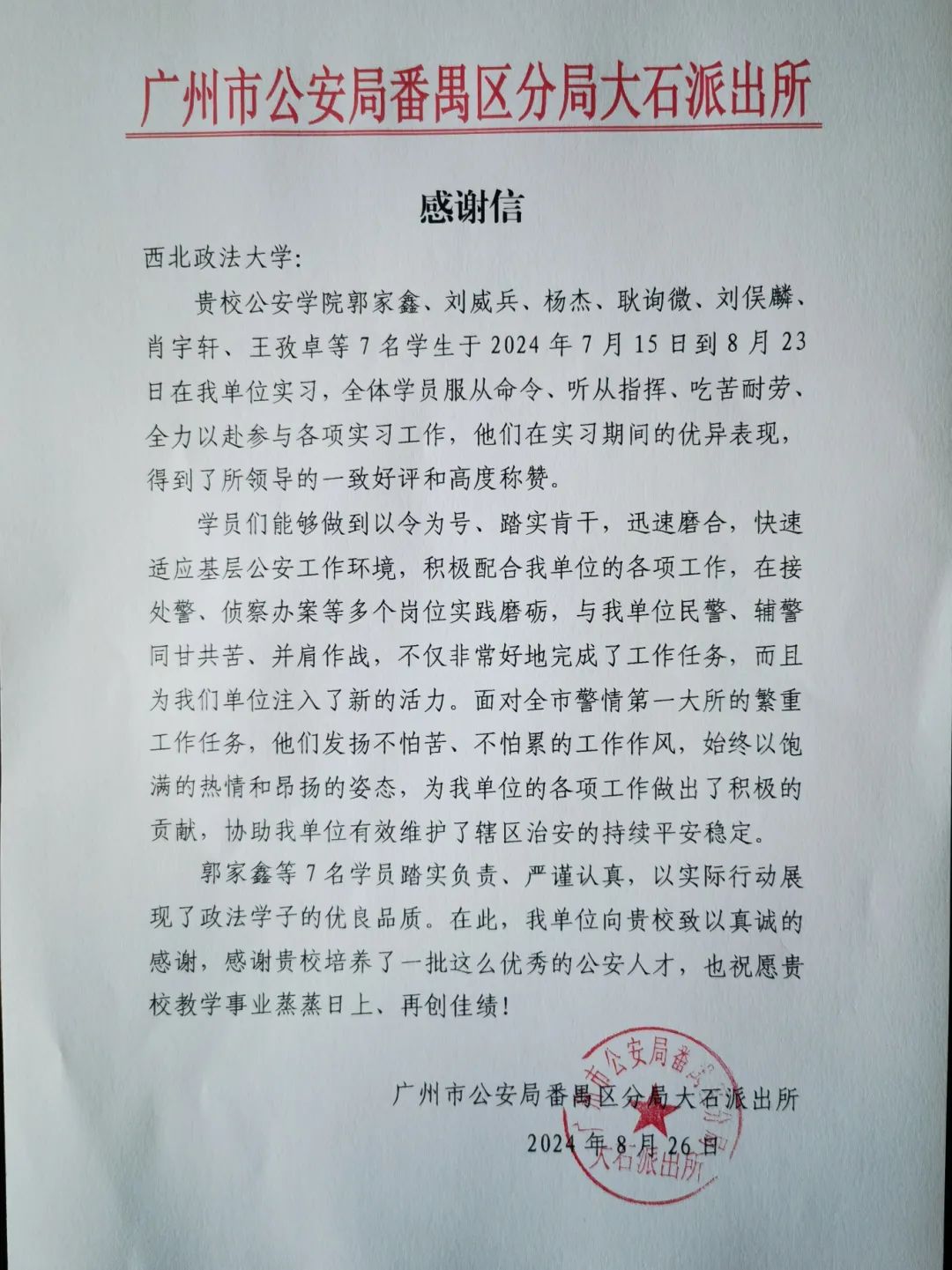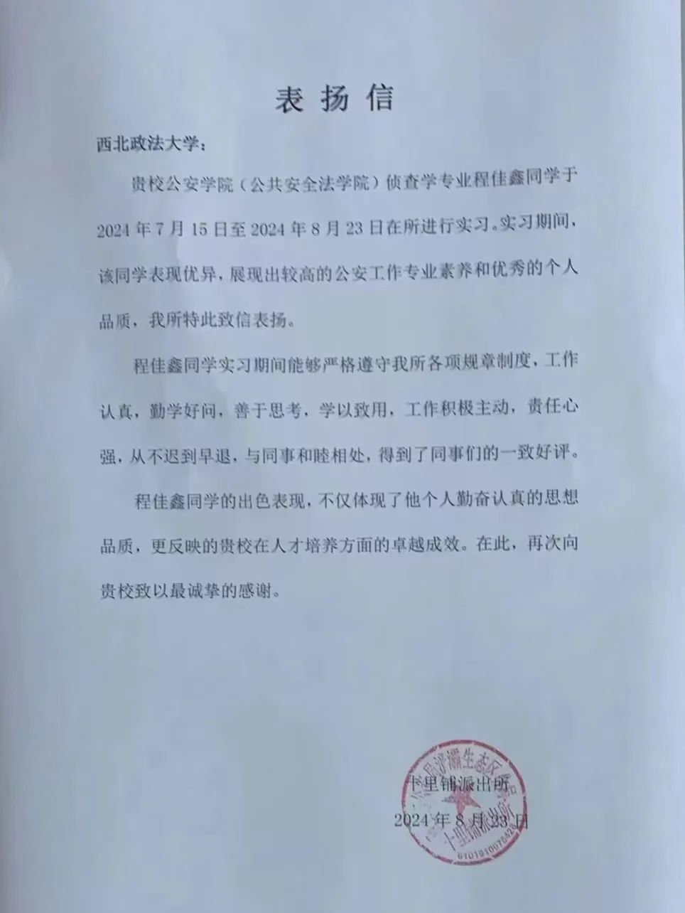 在暑期实习中,我院学子严格遵守纪律,主动承担任务,不畏艰辛,勤奋工作,其优秀的实习表现和积极的工作态度赢得了实习单位的一致好评。陕西省司法厅法治督察处、内江市公安局东兴区分局刑事科学技术室、内江市公安局经济开发区分局壕子口派出所、广州市公安局番禺区分局新客运站派出所、广州市公安局番禺区分局大石派出所、陕西省宝鸡市中级人民法院审判督察庭等单位对我院学子给予充分肯定,并致以表扬信,这是他们在实习中勇于探索、勤于实践的最好证明。