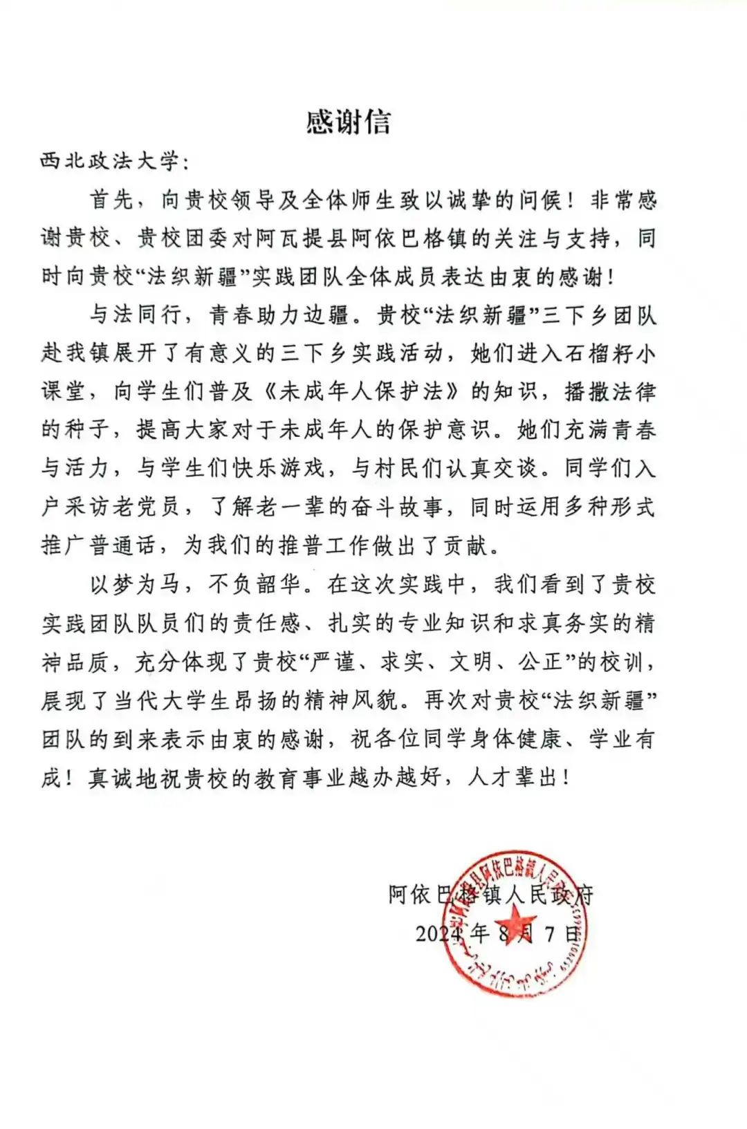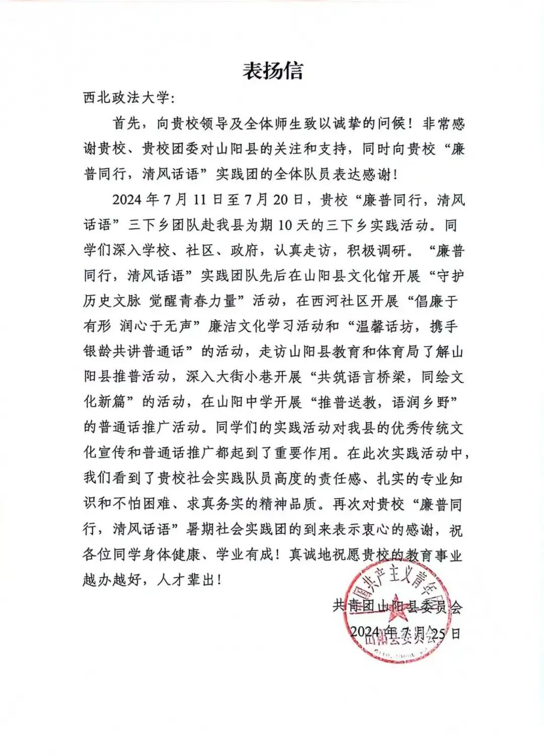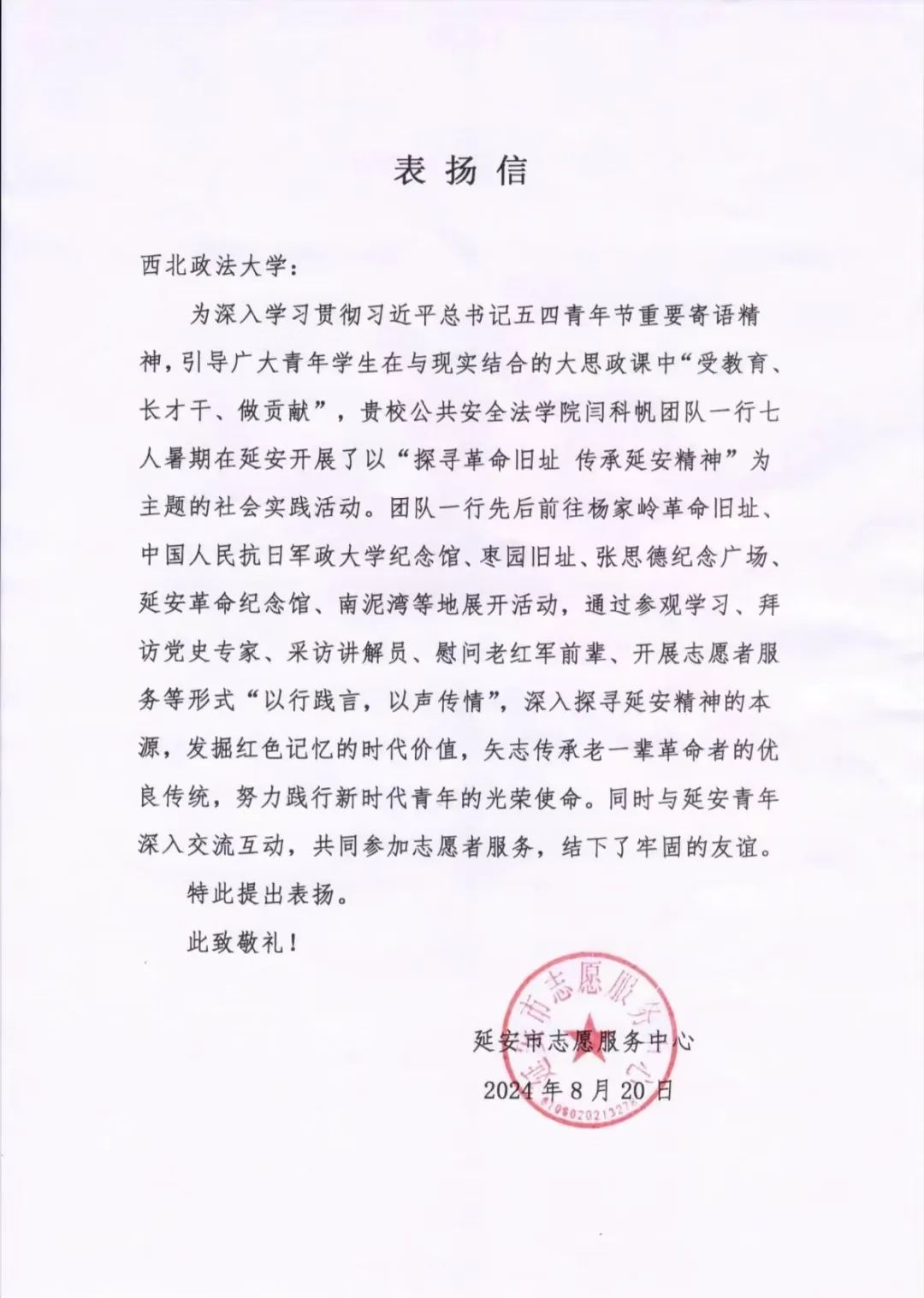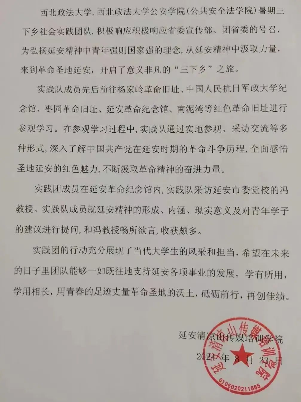 在暑期实践中,我院实践队员聚焦社会热点、投身基层服务、助力乡村振兴,他们以出色的表现赢得了社会各界的好评,收到了来自延安市志愿服务中心、阿依巴格镇人民政府、中共城关街道西河社区委员会、共青团山阳县委员会、延安清凉山传媒培训学院等单位的表扬信。他们以实际行动践行社会责任和青年担当,展现了公安学子良好的精神面貌。