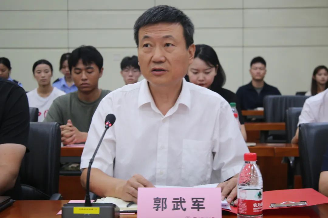 郭武军在致辞中对王丙乾一行表示热烈欢迎,对参与活动筹备的老师同学们表达诚挚感谢。他在讲话中高度赞扬了天安门国旗护卫队的崇高精神,并鼓励我校国旗护卫队队员不断向榜样看齐,以青春热血践行“护旗就是护国”的忠诚。同时,他全面介绍了我校的历史沿革与光荣传统,以及我校国护队的发展情况与优秀队员。他强调红色基因是我校最鲜明的底色,政治坚定是“老延大”优良传统的灵魂,思想政治工作是学校各项工作的生命线,要认真学习贯彻习近平总书记在全国教育大会上的重要讲话精神,牢牢把握教育的政治属性,教育引导学生不断坚定理想信念,厚植爱国主义情怀。最后,他表达了对双方加强交流合作的希望,助力拓展我校思政教育的内涵和外延,持续巩固立德树人成效。
