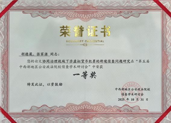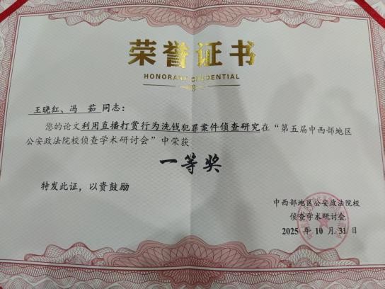 本次会议聚焦人工智能下侦查学理论与实务问题的研讨,具体包括了两场主旨报告以及“智慧侦查实务交流”“理论前沿研讨”两个专题板块。我院青年博士胡翔老师在“理论前沿板块”做了《人工智能赋能电子数据真实性审查》为题的主旨报告。另外,本次会议收录了相关学术论文,胡翔博士和本科生孙煜卓撰写的论文《人工智能赋能电子数据真实性审查》获会议论文特等奖,胡德葳副教授和硕士研究生张家源撰写的《协同治理视域下涉虚拟货币犯罪的跨境侦查问题研究》、王晓红博士和硕士研究生冯茹撰写的《利用直播打赏行为洗钱犯罪案件侦查研究》获得了一等奖。