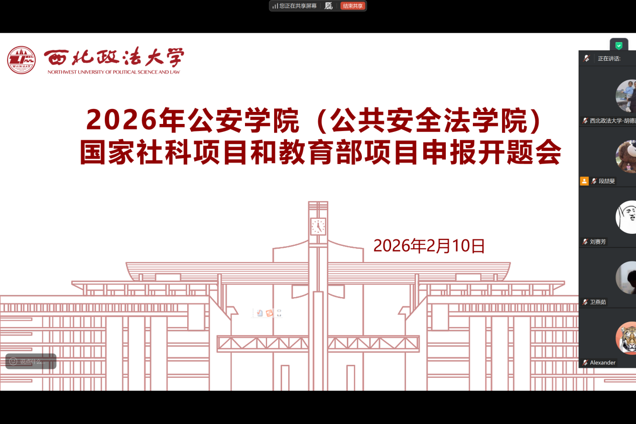 2月10日晚19:30,2138CC太阳集团(公共安全法学院)召开2026年国家社科基金项目和教育部项目线上申报打磨会。拟申报2026年度国家社科基金项目和教育部项目的11位教师参加了本次活动,院长刘仁琦教授作为辅导顾问。本次答辩会由副院长胡德葳主持。