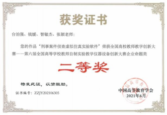 4.刑事案件侦查虚拟仿真实验中心教学软件获得国家发明专利授权,是公安政法院校首个公安类虚拟仿真实验教学软件,荣获“2016年高等学校虚拟仿真实验教学资源建设成果二等奖”。2021年获得第六届全国高等学校教师自制实验教学仪器设备创新大赛二等奖。2023年刑事案件侦查虚拟仿真综合实验课程获得国家级虚拟仿真实验教学一流课程。2024年4月刑事案件侦查虚拟仿真教学创新实验室获批教育部高等学校虚拟仿真教学创新实验室。