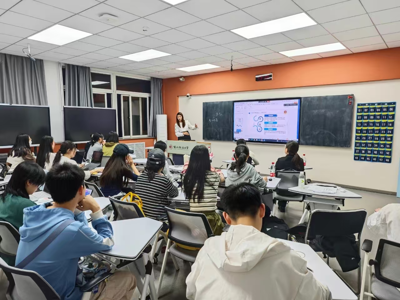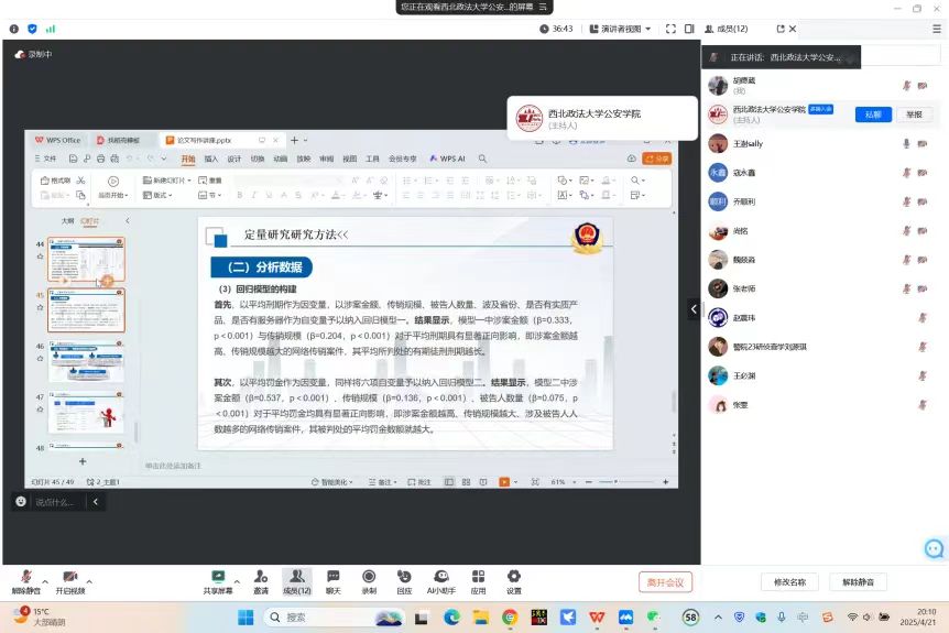 董昊贇老师深入浅出地讲解了如何收集整理裁判文书网上的案例以及如何运用定性研究和定量研究分析案例,撰写论文。针对研究生普遍关注的论文写作如何进行数据分析的问题,董老师鼓励学生们学习制作GIS图、运用SPSS统计分析软件、使用Nvivo制作访谈资料模型以对裁判文书网案例进行研究。此外,董老师还细致地介绍了定性研究方法中的访谈法、观察法、文献研究和内容分析,让同学们对于公安法学研究范式有了更加深入的理解。在互动交流环节,同学们踊跃提问。董老师耐心地逐一解答,她对学生的提问给予了详细的回应。同学们纷纷表示受益良多,现场气氛热烈。