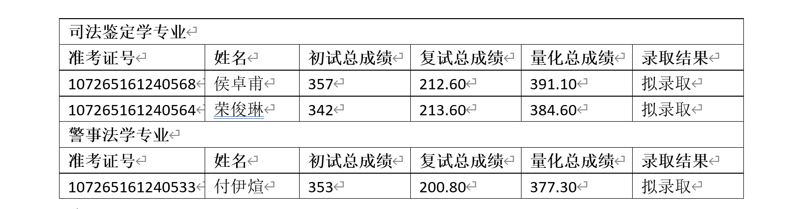 因招生计划调整,根据我校招生领导小组会议决定,按照量化总成绩补录警事法学专业一名、司法鉴定学专业二名(具体名单见附件)。公示期:公布之日起7日。如有异议,请于公示期内以书面形式报我院教务办(长安校区天平楼B座一层109办公室),逾期不予受理。