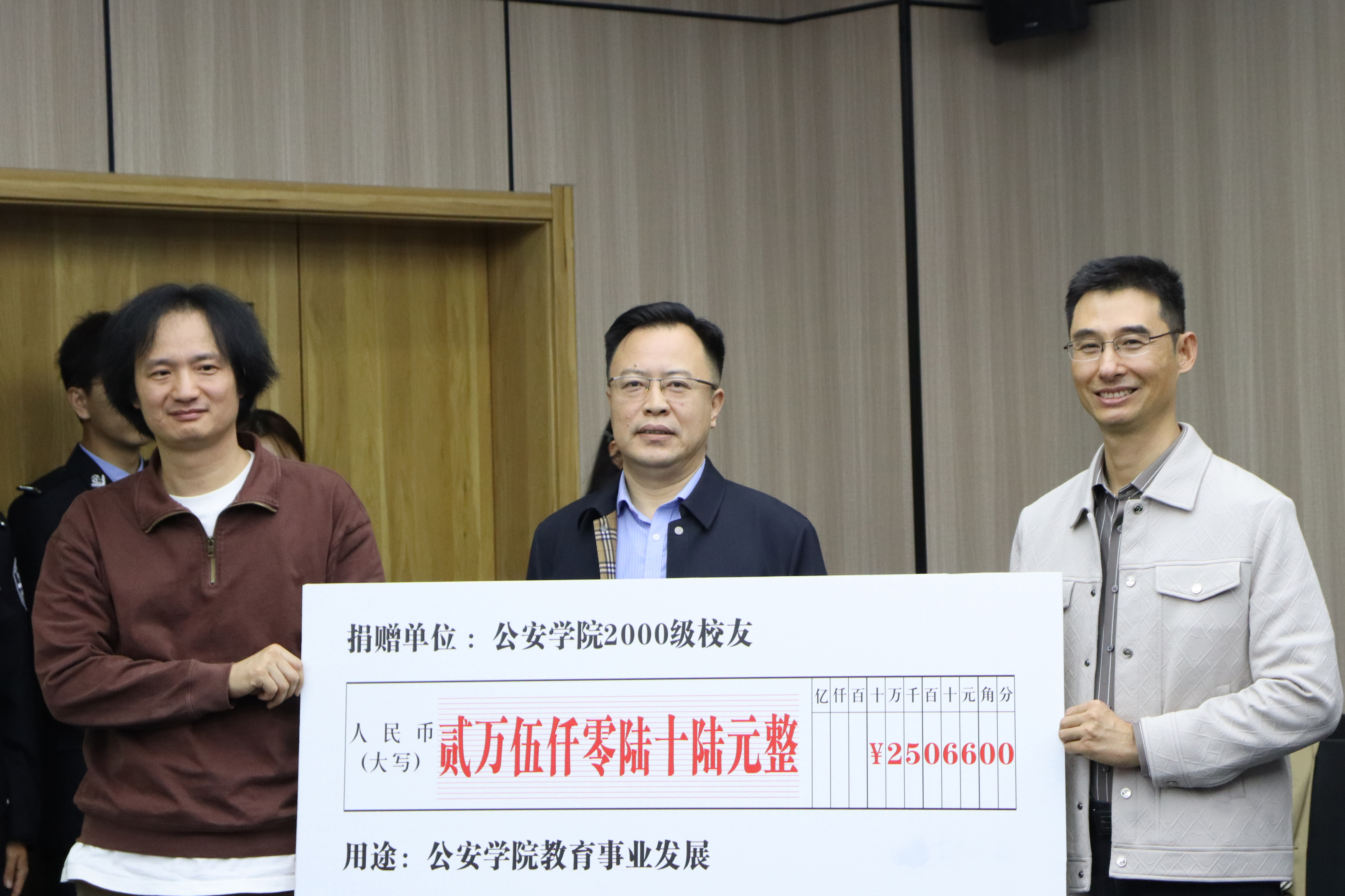 ▲黄彬、杨武代表 2000 级校友向学院捐赠,闫小军代表学院接收捐赠
