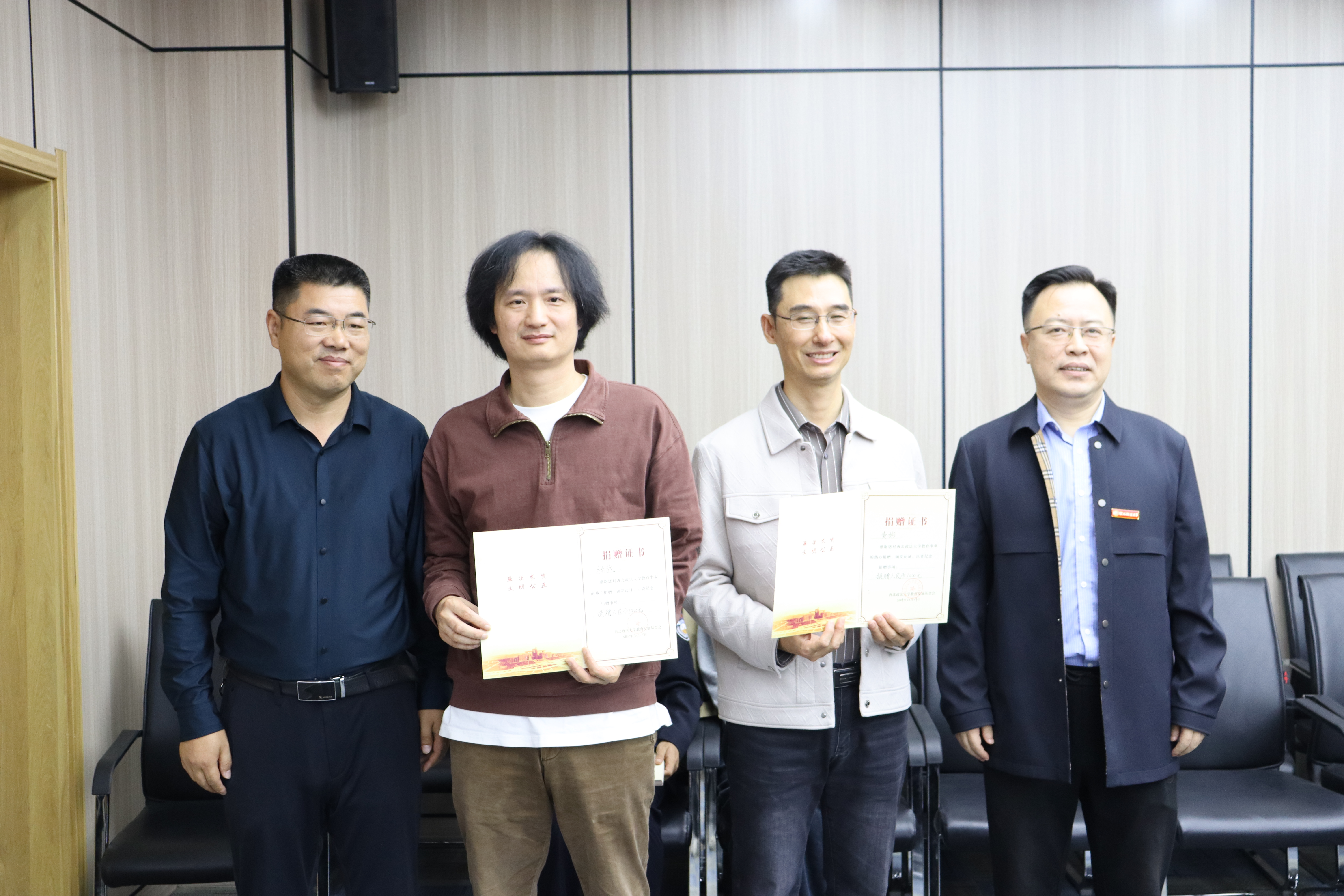 ▲李永宁、闫小军代表学院向黄彬和杨武颁发捐赠证书